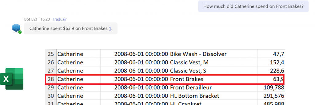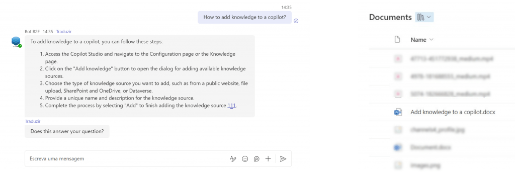 Ao adicionar ficheiros locais (Excel, Word, PDF, PowerPoint) à knowledge base do copiloto, é possível fazer perguntas sobre o conteúdo desses documentos: