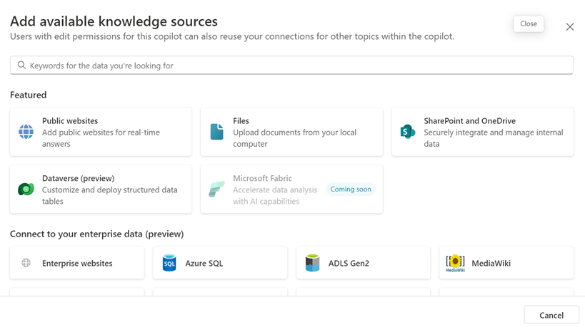 O Copilot Studio permite treinar copilotos com dados provenientes de: